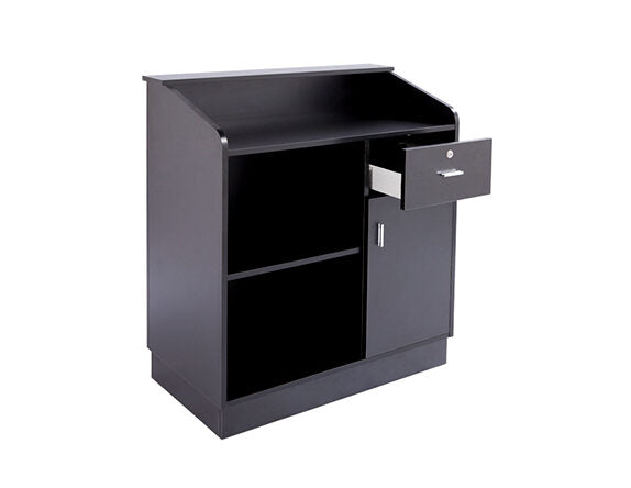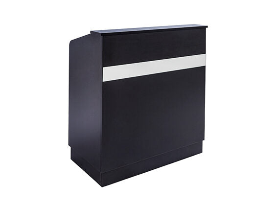 Comptoir d'accueil Hawaii pour salons de coiffure, barbiers et instituts de beauté. Compact et moderne, ce modèle noir arbore une bande blanche sur la façade qui apporte une touche d'élégance au comptoir. Il comprend un tiroir verrouillable, une étagère latérale ouverte et une porte avec espace de rangement, idéal pour organiser l'espace de service.
