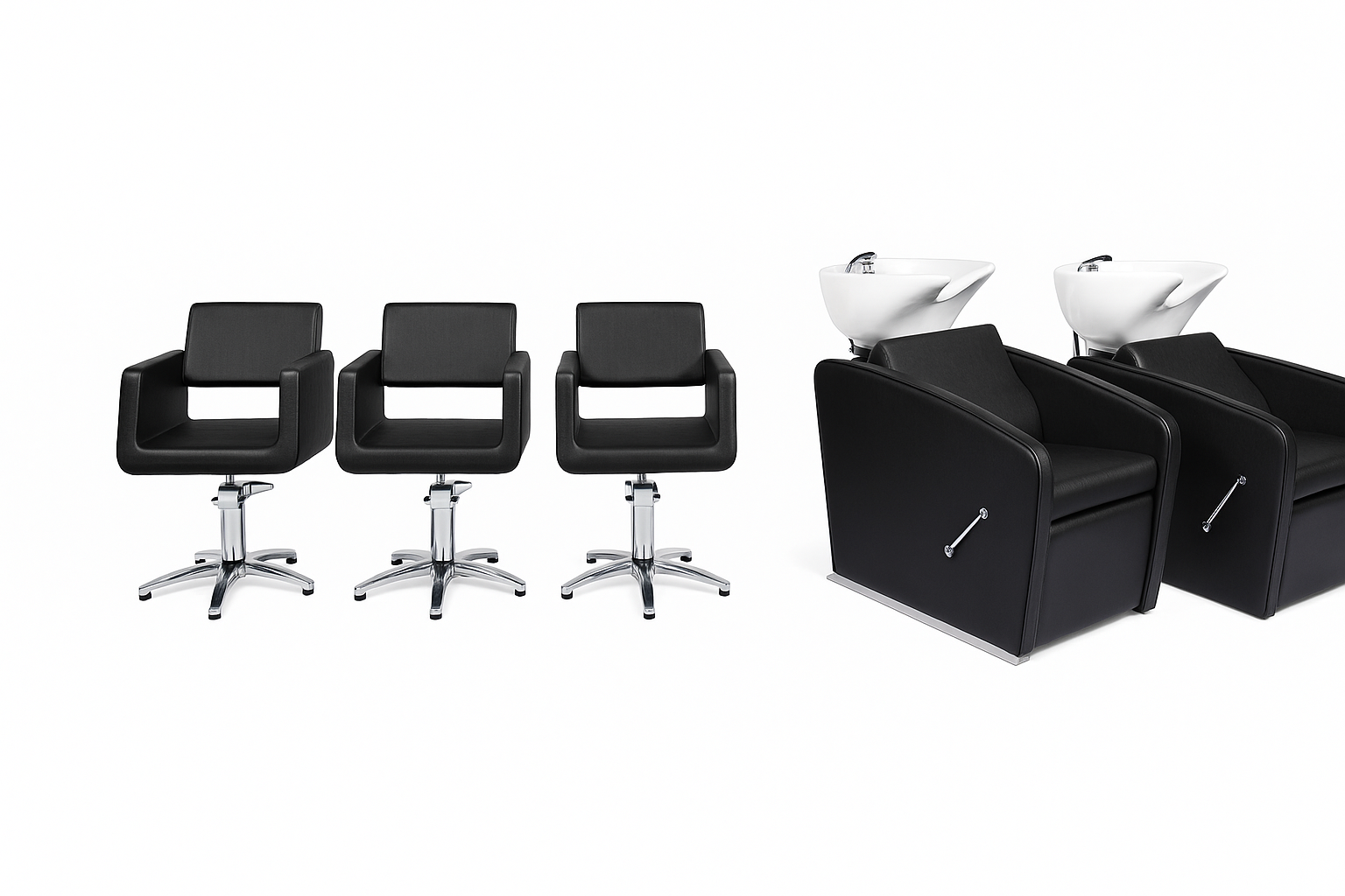 Pacote de salão de cabeleireiro Camelia & Gredos – 3 cadeiras + 2 taças de champô