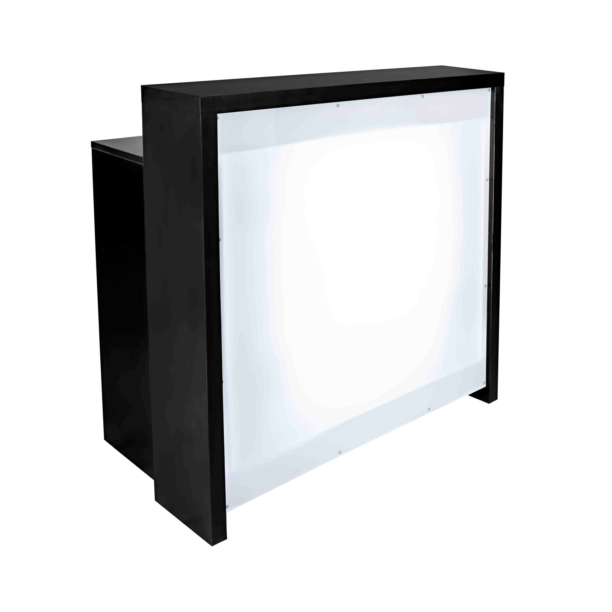 Frente branca com iluminação de fundo, moldura preta minimalista. -